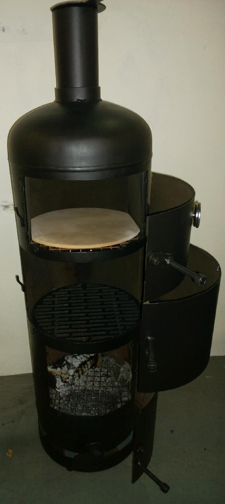OUR PORTABLE WOOD BURNING BBQ HAS A LARGE OVEN SECTION WITH A REMOVABLE PIZZA STONE AND TEMPERATURE GAUGE.